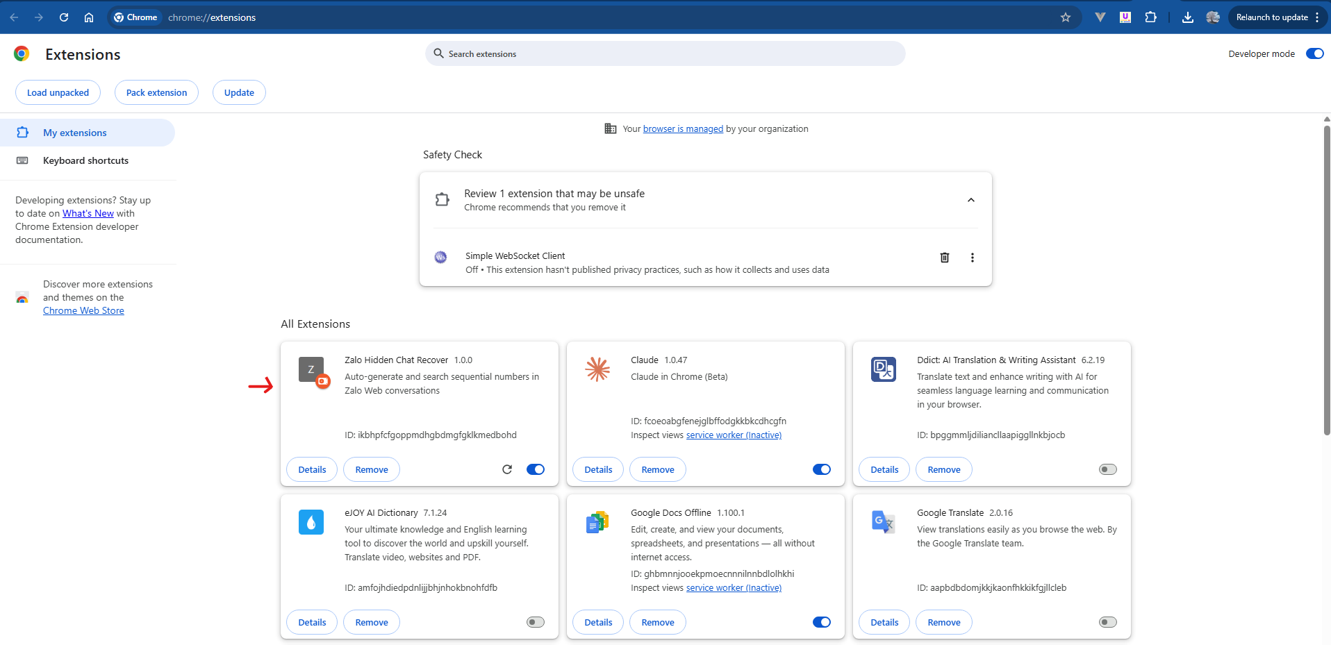 Sau khi cài đặt từ Chrome Web Store, đảm bảo extension đã được kích hoạt trong phần quản lý extension: chrome://extensions/ của trình duyệt.