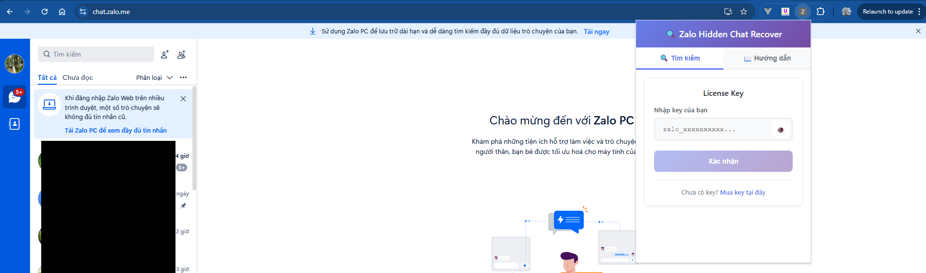 Làm theo các bước dưới đây để khôi phục mã PIN cuộc trò chuyện bí mật trên Zalo bằng extension và API key.